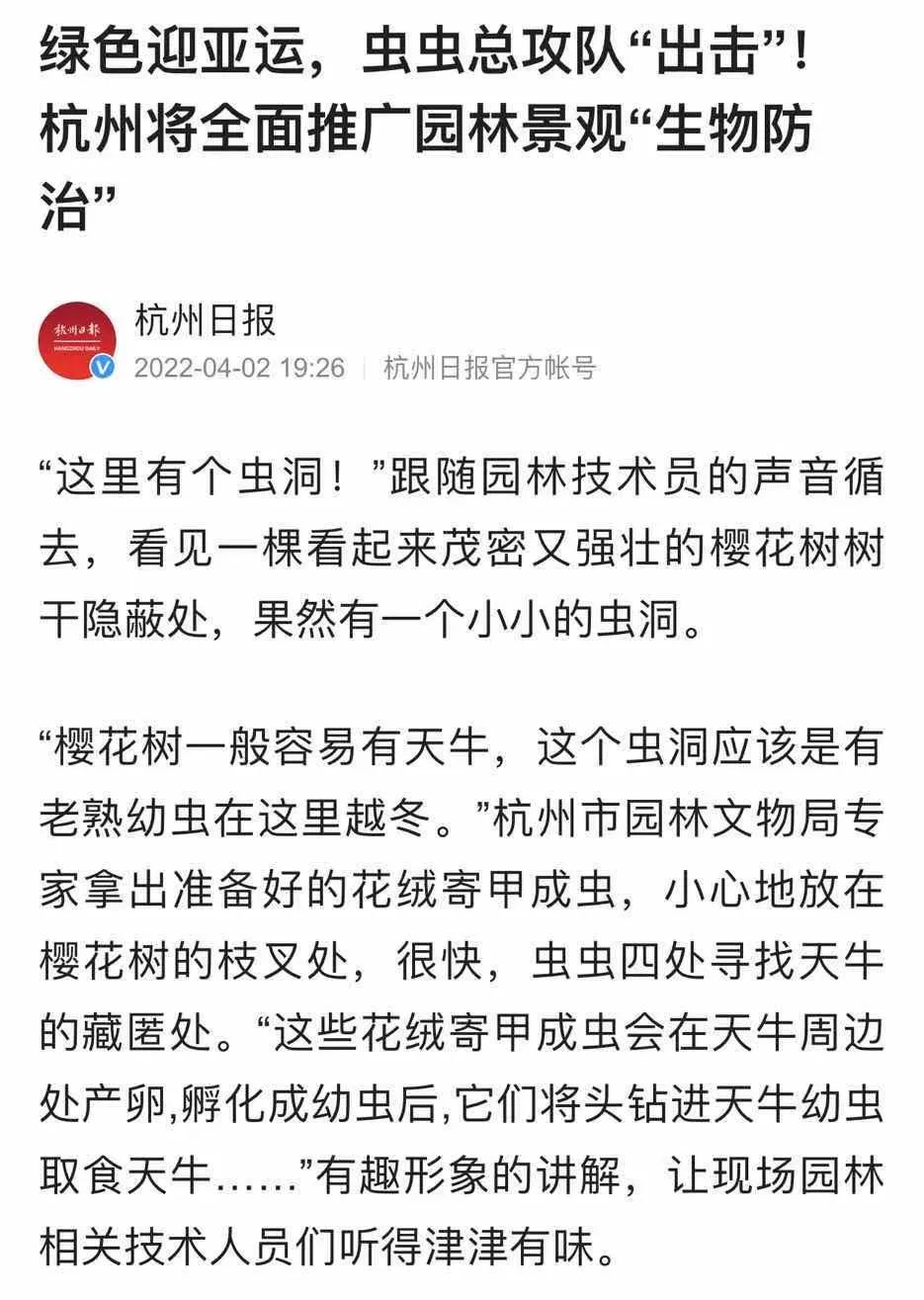近期杭州日報報道:綠色迎亞運,蟲蟲總攻隊“出擊”!杭州將全面推廣園林景觀“生物防治”。